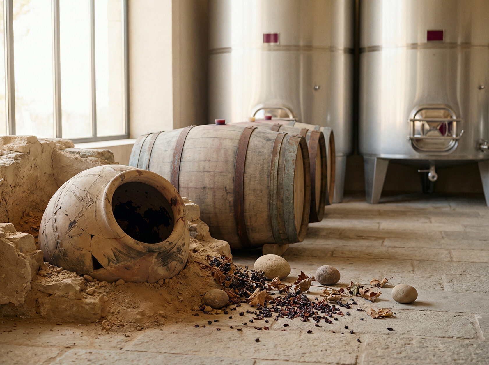 Вино здесь не было отдельным ремеслом. Оно существовало внутри сельского уклада. Гроздья давили, сок бродил сам, сосуды зарывали в землю. Эти принципы – контакт с глиной, временем и температурой – до сих пор используются в традиционных методах виноделия.
